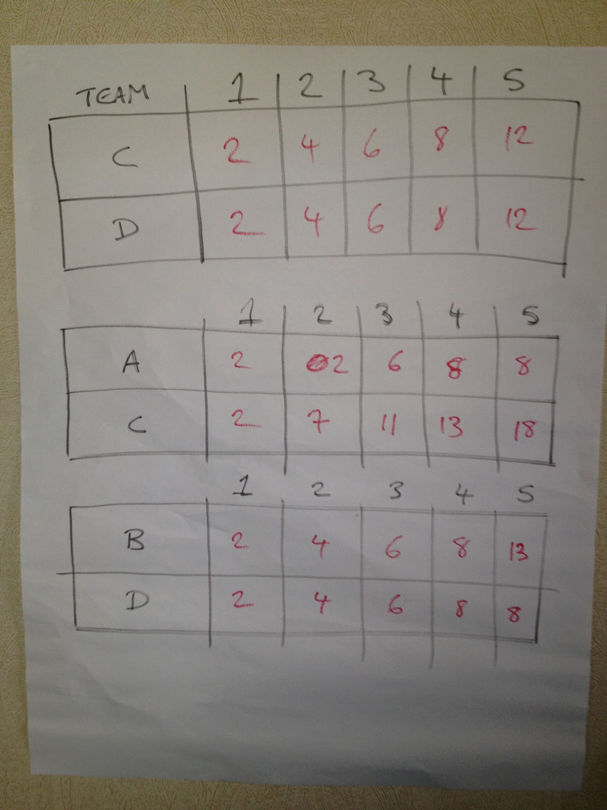 The scores (if you look carefully you should be able to notice the coalition - Jason chose the name for team D just to make me twitch...):